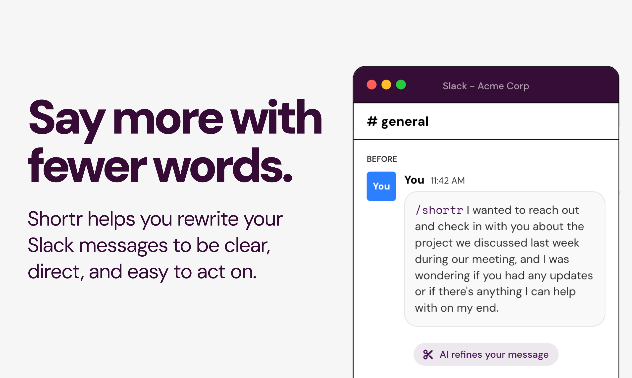 Clear ile Slack'teki iletişim kaliteni artırabilir, zamandan tasarruf edebilir ve ekip içi uyumu güçlendirebilirsin. Uygulama, mesajlarını analiz ederek daha net ve etkili olman için sana yol gösteriyor. Üstelik gizliliğin de ön planda tutuluyor; hiçbir mesajın saklanmıyor.
