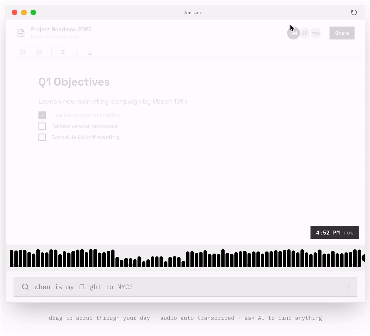 - LLM Entegrasyonu: Kayıtlarınızı doğrudan yapay zeka modellerine bağlayarak, "Geçen hafta X projesi hakkında konuşurken hangi detayı kaçırdım?" gibi sorularınıza saniyeler içinde cevap bulmanızı sağlar. Bilgi dağarcığınızla konuşmak gibi düşünün.