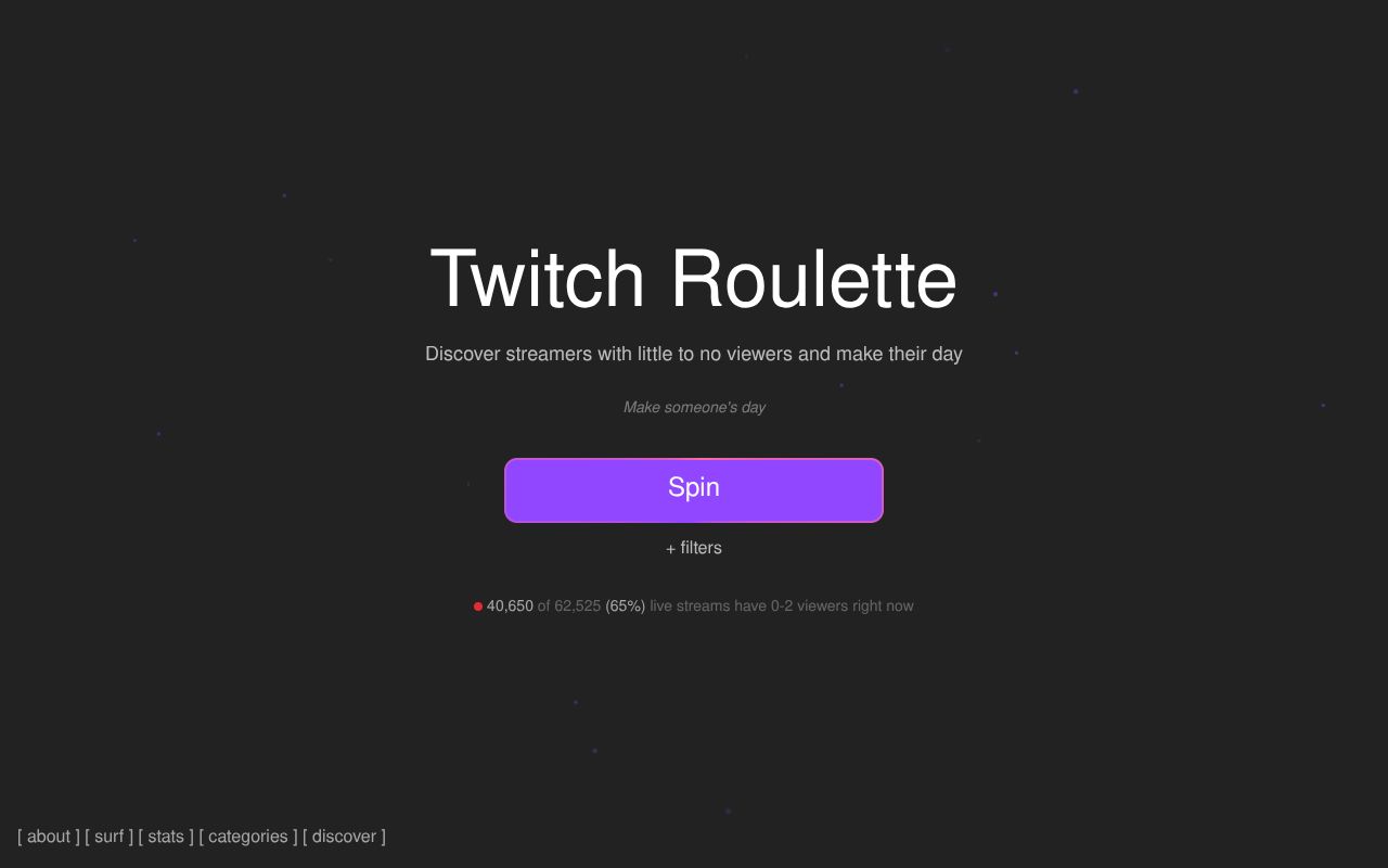 Özet: Twitch Roulette, size az izleyicisi olan Twitch yayıncılarını rastgele keşfetme imkanı sunar. Böylece yeni içerikler bulur, yayıncılara destek olur ve onların gününü güzelleştirirsin.